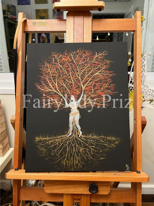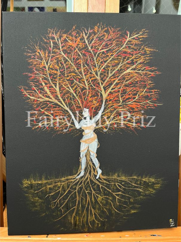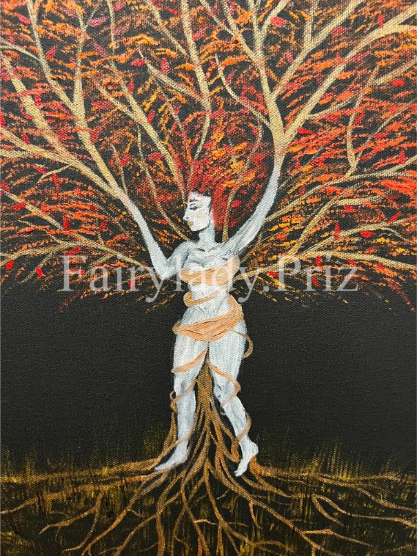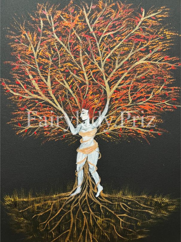 Mulher árvore que se expande em todas as direções, para o céu, para a terra.